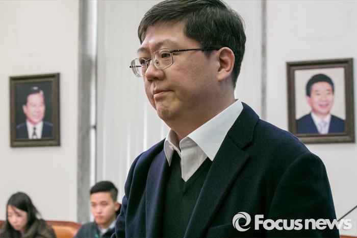 (서울=포커스뉴스) 김대중 전 대통령의 삼남 김홍걸 연세대 김대중 도서관 객원교수가 24일 오전 서울 여의도 국회 더불어민주당 당대표실에서 입당 기자회견을 마치고, 고 김대중(왼쪽) · 노무현(오른쪽) 전 대통령의 사진 옆을 지나고 있다.