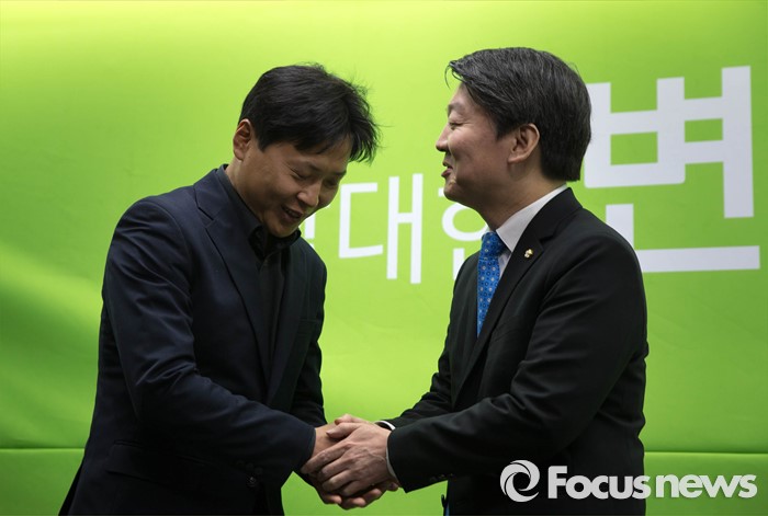 (서울=포커스뉴스) 24일 오전 서울 마포구 국민의당 당사에서 안철수(오른쪽) 인재영입위원장이 곽선우 변호사의 국민의당 공식 입당을 발표하고, 취재진 앞에서 곽 변호사와 함께 악수하고 있다.
