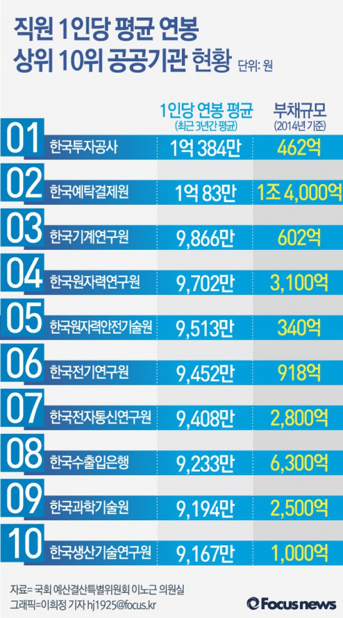 (서울=포커스뉴스) 24일 국회 예산결산특별위원회 이노근 의원이 총 316개 공공기관의 2012~2014년까지 최근 3년간 직원 1인당 연봉을 조사한 결과에 따르면 원 1인당 연봉이 가장 높은 곳은 한국투자공사로 1억384만원이다.