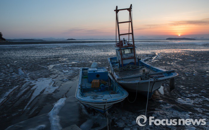 (강화=포커스뉴스) 한파경보가 발효된 24일 인천시 강화군 동검도 앞 바다와 갯벌도 꽁꽁 얼어붙어 어선도 묶여 있다.