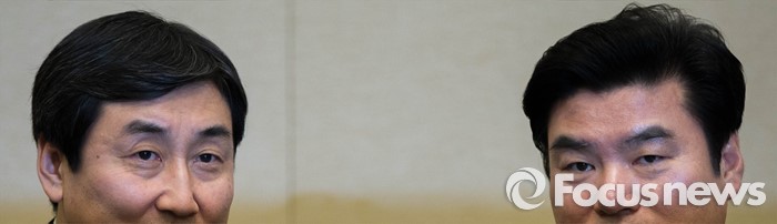 (서울=포커스뉴스) 새누리당 원유철(오른쪽), 더불어민주당 이종걸 원내대표가 24일 오후 서울 여의도 국회 귀빈식당에서 선거구획정안과 쟁정법안을 처리하기 위한 회동에 참석, 취재진을 응시하고 있다.