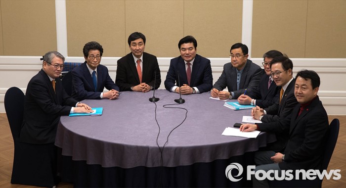 (서울=포커스뉴스) 24일 오후 서울 여의도 국회 귀빈식당에서 선거구획정안과 쟁점법안 처리를 위해 새누리당, 더불어민주당 원내지도부가 회동을 갖고 회의 시작을 기다리고 있다. 왼쪽부터 더불어민주당 김용익 의원, 더불어민주당 이목희 정책위의장, 더불어민주당 이종걸 원내대표, 새누리당 원유철 원내대표, 새누리당 김정훈 정책위의장, 새누리당 조원진 원내수석부대표, 새누리당 강석훈 의원, 새누리당 김용남 원내대변인.