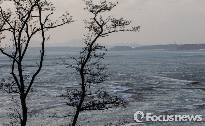 (강화=포커스뉴스) 한파경보가 발효된 24일 인천시 강화군 동검도 앞 바다와 갯벌도 꽁꽁 얼어붙어있다.