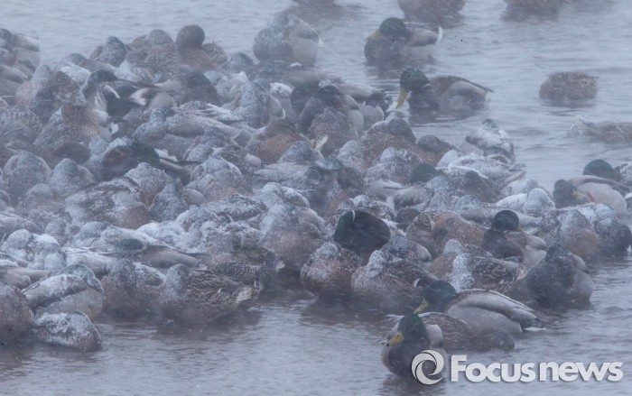 (서산=포커스뉴스) 겨울철새 청둥오리들이 25일 오전 계속되는 한파특보속에 충남 서산시 천수만에서 눈보라를 피해 서로 똘똘 뭉쳐 있다.