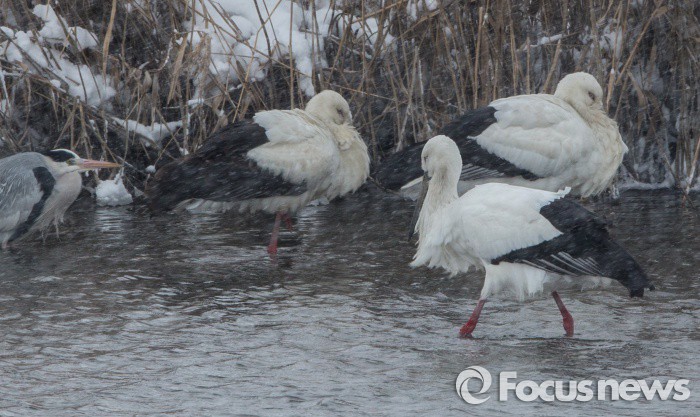 (서산=포커스뉴스)한파특보가 계속되고 있는 25일 오전 충남 천수만 해미천에 한반도에서 월동 중이던 국제보호조 황새(천연기념물199호)들이 한자리에 모여 강추위를 피하고 있다.