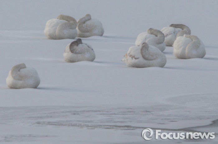 (서산=포커스뉴스) 한파특보가 계속되고 있는 25일 오전 충남 서산시 천수만에서 큰고니(천연기념물201호) 들이 얼어붙은 해미천의 눈밭에서 머리를 깃털속에 처박고 추위를 피하고 있다.