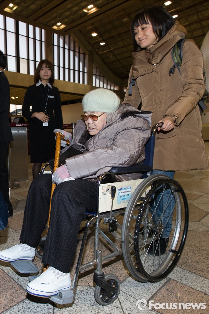 (서울=포커스뉴스) 지난 해 12월 28일 한일 위안부 문제 합의 이후 처음으로 일본을 방문하여 위안부 피해 참상을 증언하기 위해 위안부 피해자 이옥선 할머니가 25일 오전 서울 김포공항에서 출국장으로 들어가고 있다.