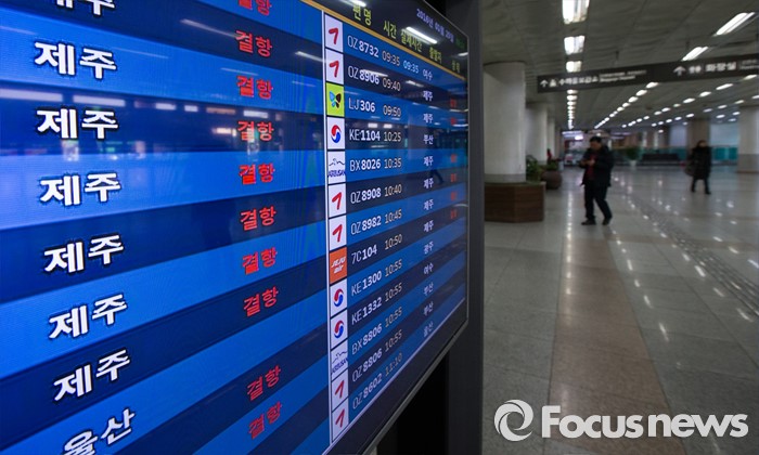 (서울=포커스뉴스) 25일 오전 서울 김포공항 국내선 청사에 제주에서 김포로 오는 항공편의 결항 안내문이 게시되고 있다.