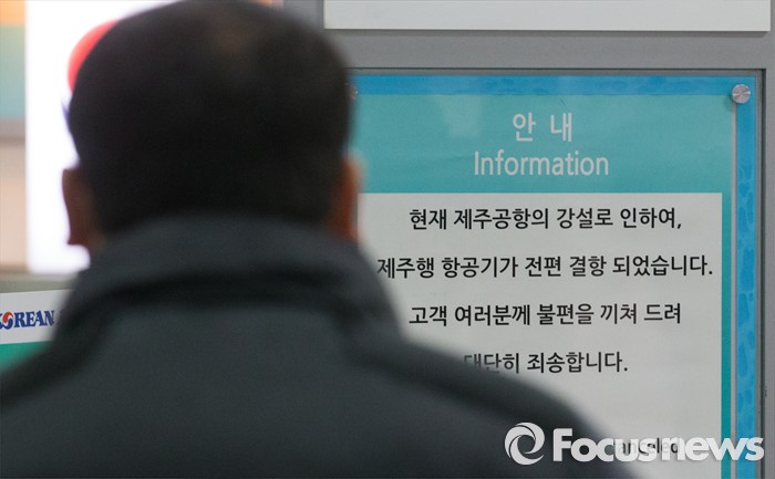 (서울=포커스뉴스) 25일 오전 서울 김포공항 국내선 청사에서 관광객이 제주공항 결항 안내문을 바라보고 있다.