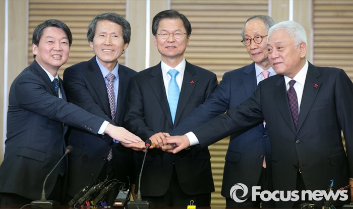(서울=포커스뉴스) 25일 오전 서울 여의도 국회 의원회관에서 국민의당-국민회의 통합발표 기자회견을 마친 뒤 안철수(왼쪽부터) 국민의당 인재영입위원장, 한상진 공동창당준비위원장, 천정배 국민회의 창당준비위원장, 윤여준 국민의당 공동창당준비위원장, 김한길 상임부위원장이 취재진을 향해 포즈를 취하고 있다.