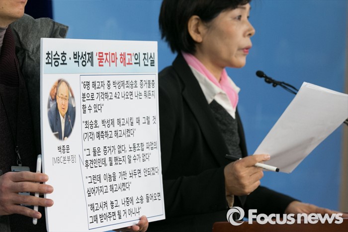 (서울=포커스뉴스) 국회 미래창조과학방송통신위원회 위원인 최민희 더불어민주당 의원이 25일 오전 서울 여의도 국회 정론관에서 지난 2012년 파업으로 해고된 MBC 최승호 PD, 박성제 기자와 관련된 백종문 MBC 미래전략본부장의 녹취록을 공개하고 있다. 녹취록에서 백 본부장은 '최 PD와 박 기자는 증거 없지만 해고 시킨 것'이라 말했다.
