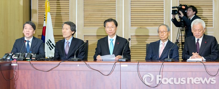 (서울=포커스뉴스) 25일 오전 서울 여의도 국회 의원회관에서 열린 국민의당-국민회의 통합발표 기자회견에 참석한 안철수(왼쪽부터) 국민의당 인재영입위원장, 한상진 공동창당준비위원장, 천정배 국민회의 창당준비위원장, 윤여준 국민의당 공동창당준비위원장, 김한길 상임부위원장이 회견문을 낭독하고 있다.