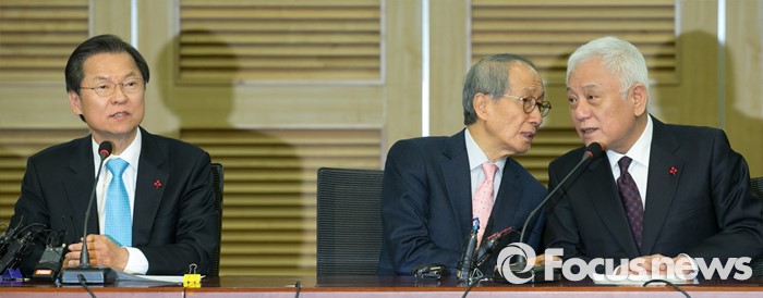 (서울=포커스뉴스) 25일 오전 서울 여의도 국회 의원회관에서 열린 국민의당-국민회의 통합발표 기자회견에 참석한 천정배(왼쪽) 국민회의 창당준비위원장이 취재진 질문에 답하고 있는 도중 윤여준(가운데) 국민의당 공동창당준비위원장, 김한길 상임부위원장이 대화하고 있다.