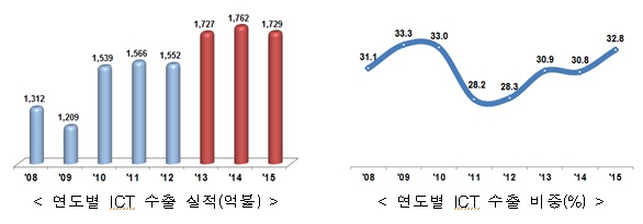 (서울=포커스뉴스) 지난해 정보통신기술(ICT) 수출이 전년보다 1.9% 감소한 1728억9000만 달러에 그쳤다.하지만 세계 ICT(정보통신기술) 성장률이 감소(2015년 세계 ICT 성장률은 -5.8%) 등 어려운 여건 속에서 ICT 수출은 3년 연속 1700억달러대를 지켜냈다.