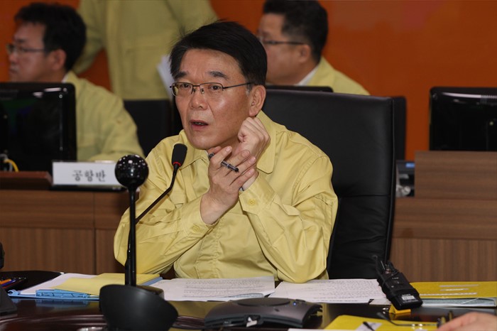 (세종=포커스뉴스) 강호인 국토교통부 장관이 25일 오전 세종시정부세종청사 국토부 국가교통정보센터에 마련된 제주공항체류여객 비상수송대책본부를 방문해 현황 점검을 하고 있다. <사진제공=국토교통부>