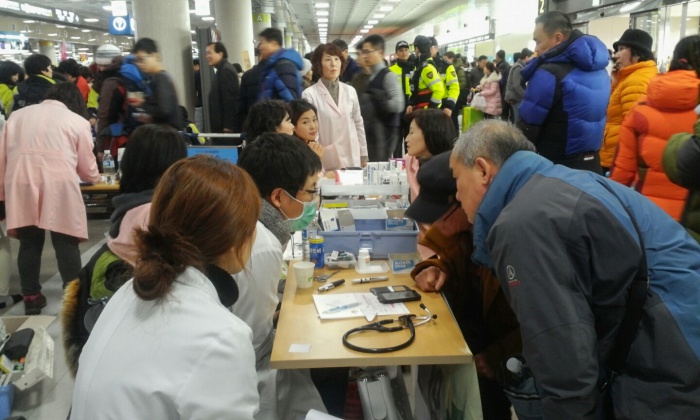 (서울=포커스뉴스) 32년 만에 폭설로 제주국제공항이 폐쇄된지 3일째 되는 25일 오후 응급 환자 발생을 대비해 파견된 의료진들이 제주국제공항 대합실에서 관광객들을 상대로 상담을 하고 있다. 국토교통부는 25일 오후 12시를 기해 운항을 재개한다고 밝혔다. 하지만 항공기에 쌓인 눈을 제거하는 등 작업들이 남아 있어 실제적인 운항재개는 오후 3시부터 이루어질 전망이다. <사진제공=김세희 사진가>