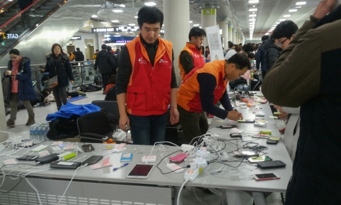 (서울=포커스뉴스) 32년 만에 폭설로 제주국제공항이 폐쇄된지 3일째 되는 25일 오전 제주국제공항 대합실에 모인 관광객들이 핸드폰 충전을 하고 있다.