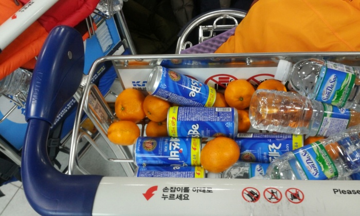 (서울=포커스뉴스) 32년 만에 폭설로 제주국제공항이 폐쇄된지 3일째 되는 25일 오전 대합실에 대기중인 관광객의 카트 바구니에 생수, 커피, 귤이 담아져 있다.