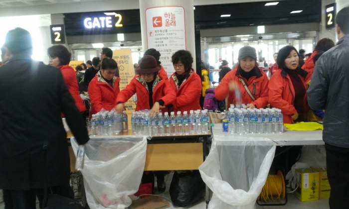 (서울=포커스뉴스) 32년 만에 폭설로 제주국제공항이 폐쇄된지 3일째 되는 25일 오후 지역 자원봉사자들이 제주국제공항 대합실에 모인 관광객들에게 생수를 나누어 주고 있다. 국토교통부는 25일 오후 12시를 기해 운항을 재개한다고 밝혔다. 하지만 항공기에 쌓인 눈을 제거하는 등 작업들이 남아 있어 실제적인 운항재개는 오후 3시부터 이루어질 전망이다. <사진제공=김세희 사진가>