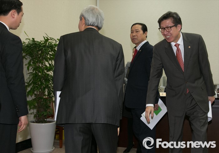 (서울=포커스뉴스) 박형준(오른쪽) 국회 사무총장이 25일 오후 서울 여의도 국회 의장집무실로 향하는 새누리당 초·재선 의원 모임 '아침소리' 소속 이노근(가운데), 김종훈 의원과 인사하고 있다.