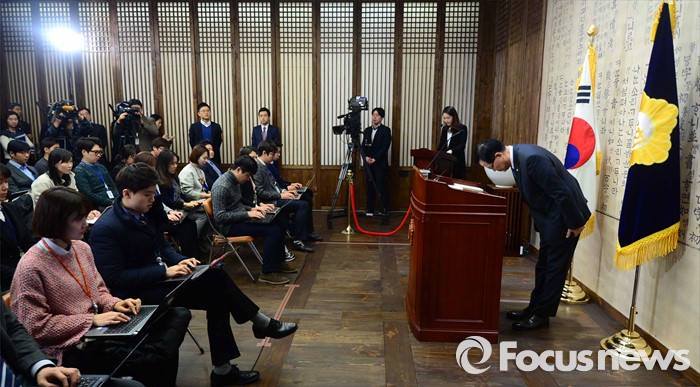 (서울=포커스뉴스) 정의화 국회의장이 25일 오후 서울 여의도 국회에서 20대 총선 불출마 선언 및 국회 선진화법 개정안에 대한 중재안 발표 기자회견을 마친 뒤 인사하고 있다.