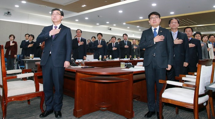 (세종=포커스뉴스) 이기권 고용노동부장관이 25일 오전 세종시 정부세종청사 고용노동부 대회의실에서 열린 전국기관장 회의에 참석해 국기에 대한 경레를 하고 있다. <사진제공=고용노동부>