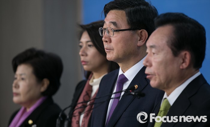 (서울=포커스뉴스) 이기권 고용노동부 장관과 이인제 새누리당 노동선진화특위원장 등 의원들이 25일 오후 서울 여의도 국회 정론관에서 노동개혁 2대 지침(일반해고 지침, 취업규칙 지침) 설명회를 마친 뒤 브리핑을 하고 있다.