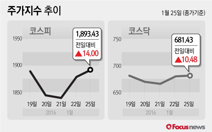 (서울=포커스뉴스) 25일 코스피지수는 전날 보다 0.74%(14.00포인트) 오른 1893.43에 장을 마쳤다. 코스닥지수는 전일 대비 1.56%(10.48포인트) 오른 681.43에 마감했다.