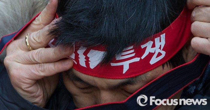 (서울=포커스뉴스) 25일 오후 서울 중구 지방고용노동청 앞에서 열린 '민주노총 수도권 총파업 결의대회'에 참가한 노조원이 머리띠를 묶고 있다.