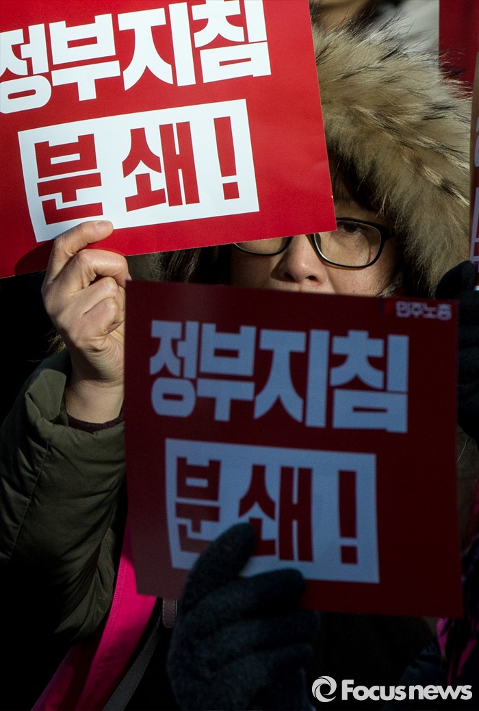 (서울=포커스뉴스) 25일 오후 서울 중구 지방고용노동청 앞에서 열린 '민주노총 수도권 총파업 결의대회'에 참가한 노조원이 정부지침 분쇄가적힌 손팻말을 들고 있다.