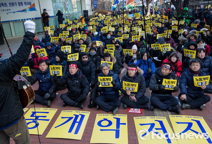 (서울=포커스뉴스) 25일 오후 서울 중구 지방고용노동청 앞에서 열린 '민주노총 수도권 총파업 결의대회'에 참가한 노조원이 구호를 외치고 있다.