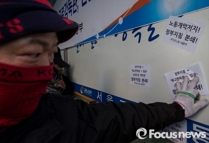 (서울=포커스뉴스) 25일 오후 서울 중구 지방고용노동청 앞에서 열린 '민주노총 수도권 총파업 결의대회'에 참가한 노조원이 노동청 벽에 '노동개악저지' 문구가 적힌 스티커를 붙이고 있다.