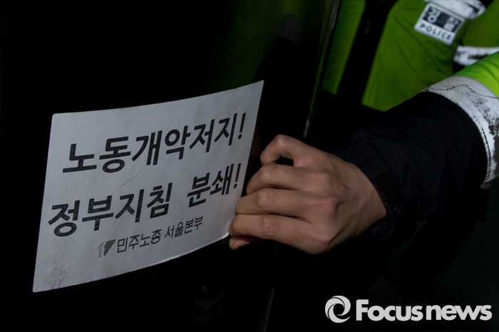 (서울=포커스뉴스) 25일 오후 서울 중구 지방고용노동청 앞에서 열린 '민주노총 수도권 총파업 결의대회'에 참가한 노조원이 노동청 벽에 붙인 항의 스티커들을 경찰이 제거하고 있다.