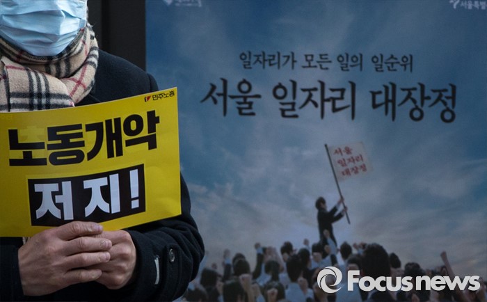 (서울=포커스뉴스) 25일 오후 서울 중구 지방고용노동청 앞에서 열린 '민주노총 수도권 총파업 결의대회'에 참가한 노조원이 노동개악 저지가 적힌 손팻말을 들고 있다.