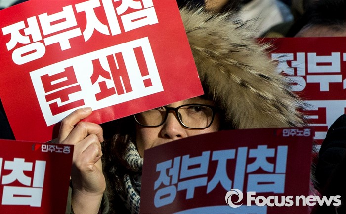 (서울=포커스뉴스) 25일 오후 서울 중구 지방고용노동청 앞에서 열린 '민주노총 수도권 총파업 결의대회'에 참가한 노조원이 정부지침 분쇄가적힌 손팻말을 들고 있다.