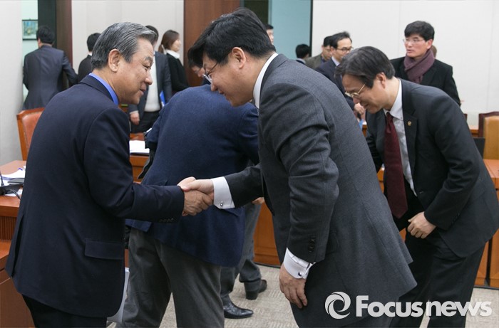 (서울=포커스뉴스) 25일 오후 서울 여의도 국회에서 산업통상자원위원회 전체회의가 산회된 후 주형환 산업통상자원부 장관과 이관섭 1차관이 의원들과 악수하고 있다. 이날 산업위는 기업활력제고를 위한 특별법(일명 원샷법)을 의결했다.