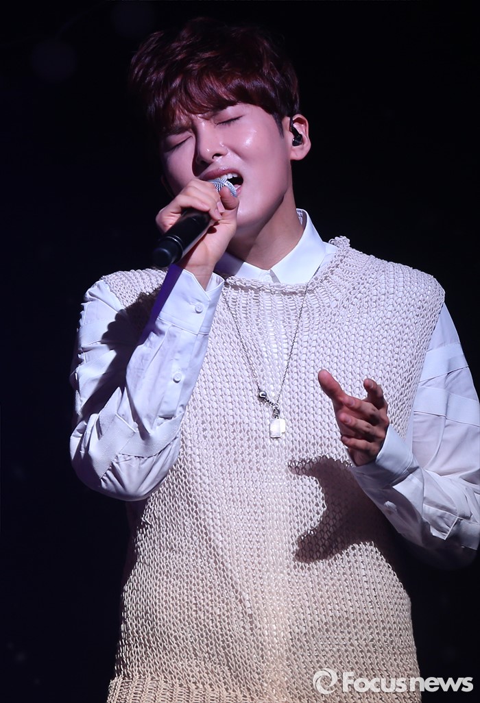(서울=포커스뉴스) 25일 오후 서울 용산구 현대카드 언더스테이지에서 열린 미니앨범 '어린왕자' 쇼케이스에 참석한 가수 려욱이 신곡 '품'의 무대를 선보이고 있다.