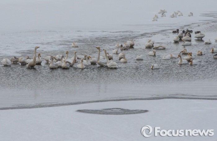 (서산=포커스뉴스) 눈발이 내리고 있는 26일충남 서산시 천수만 해미천이 대부분 꽁꽁 얼어붙고, 일부 지역에만 녹아 있자, 겨울진객 큰고니(천연기념물201호)들이 옹기종기 모여 추위를 피하고 있다. 기상청은 오늘 낮부터 한파가 물러나고 평년 기온을 되찾겠다고 예보하고 있다.