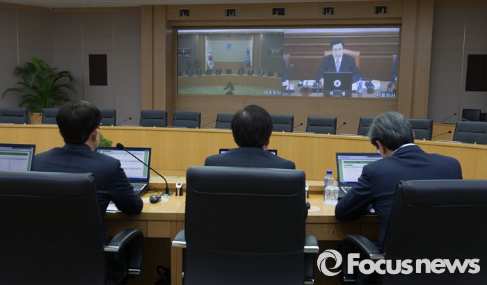 (세종=포커스뉴스) 26일 오전 세종시 정부세종청사 국무회의장에서 열린 서울-세종 영상 국무회의에서 세종청사에 참석한 국무위원들이 황교안 총리의 모두발언을 경청하고 있다.