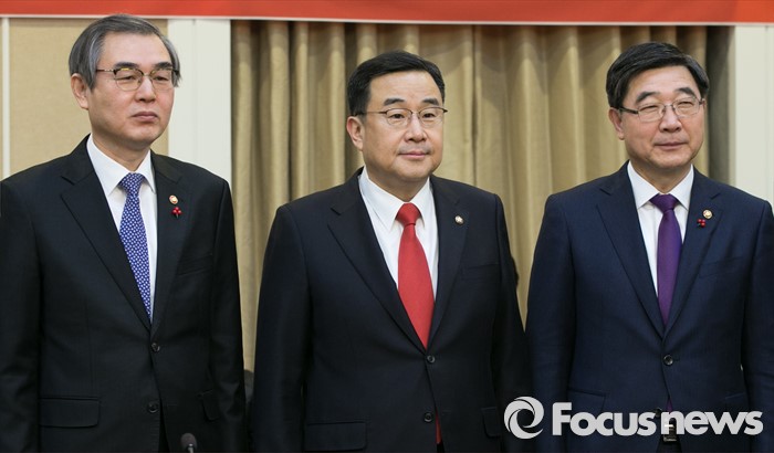 (서울=포커스뉴스) 정재찬(왼쪽부터) 공정거래위원장과 김정훈 새누리당 정책위의장, 이기권 고용노동부 장관이 26일 오전 서울 여의도 국회 귀빈식당에서 열린 '임금 체불 및 하도급대금 부조리 해결' 합동 당정협의에 참석해 기념사진을 찍고 있다.