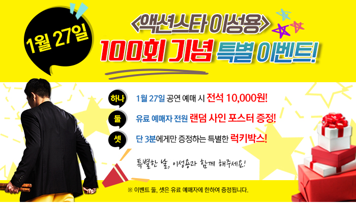 오는 27일 초연 100회를 맞이하는 연극 '액션스타 이성용'은 이를 기념하기 위해 특별한 할인 혜택과 선물 증정 이벤트를 진행한다. 먼저 100회 공연일인 27일 8시 공연은 전석 1만원에 예매할 수 있는 할인 혜택을 제공한다.