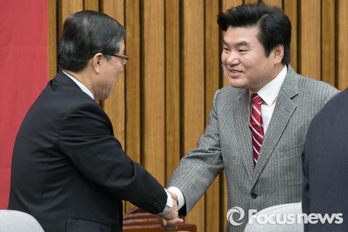 (서울=포커스뉴스) 원유철(오른쪽) 새누리당 원내대표와 황진하 사무총장이 26일 오전 서울 여의도 국회에서 열린 원내대책회의에 참석해 악수하고 있다.
