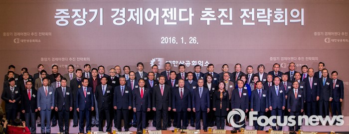 (서울=포커스뉴스) 박용만 대한상공회의소 회장을 비롯한 여야정 대표 및 산학연 대표들이 26일 오전 서울 중구 대한상공회의소 국제회의장에서 열린 '중장기 경제어젠다 추진 전략회의'에 앞서 사진촬영을 하고 있다. 이날 회의에서 규제 근본 틀 개선, 기업문화 개선, 국민 행복 위한 서비스 발전 등을 논의 할 예정이다.