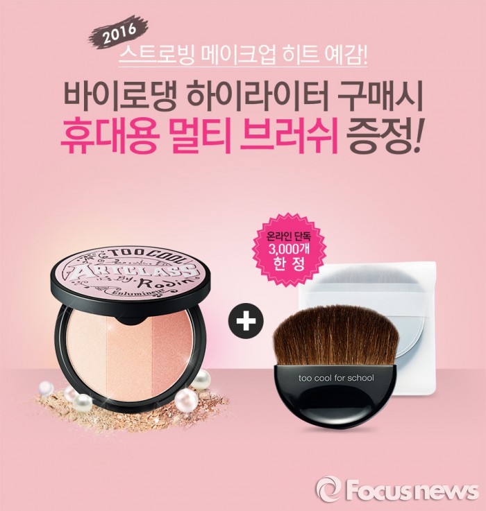 아트클래스 바이로댕 하이라이터는 3가지 컬러로 블렌딩 방법에 따라 다양한 표현이 가능한 멀티 하이라이터다. 가격은 1만7000원.멀티 브러쉬 증정 이벤트 포스터. <사진제공=투쿨포스쿨>