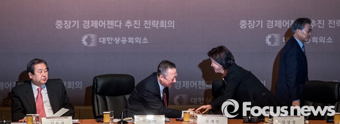 (서울=포커스뉴스) 박용만(왼쪽 두 번쨰) 대한상공회의소 회장과 심상정(오른쪽 두 번째) 정의당 상임대표가 26일 오전 서울 중구 대한상공회의소 국제회의장에서 열린 '중장기 경제어젠다 추진 전략회의'에 자리해 악수 하고 있다. 이날 회의에 자리한 여야정 대표 및 산학연 대표 70여명은 규제 근본 틀 개선, 기업문화 개선, 국민 행복 위한 서비스 발전 등을 논의 할 예정이다.