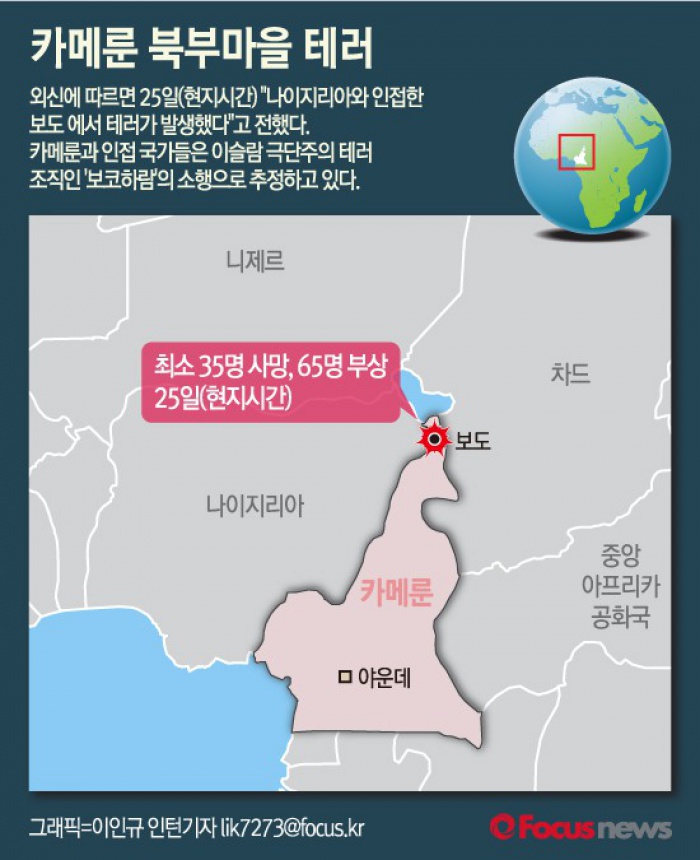 (서울=포커스뉴스) 외신에 따르면 25일(현지시간) "나이지리아와 인접한 보도 지역에서 테러가 발생했다"고 전했다. 최소 4명의 자살폭탄범에 의한 연쇄 테러로 카메룬 북부 마을 보도에서 최소 35명이 사망하고 65명이 부상을 입었다고 보도했다. "테러범 2명은 시장에서, 나머지 2명은 마을에서 폭탄을 터뜨렸다"고 했다.