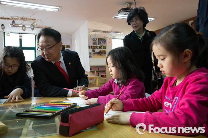(서울=포커스뉴스) 누리과정 관련 현장을 방문한 유일호 경제부총리 겸 기획재정부 장관이 26일 오전 서울 강서구 보라유치원에 방문해 아이들이 노는 모습을 지켜보고 있다.