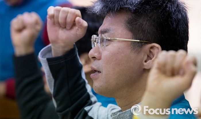 (서울=포커스뉴스) 26일 오전 서울 서대문구 전국교직원노동조합 대회의실에서 변성호 전교조 위원장이 법외노조통보 항소심 판결과 교육부 후속조치에 대한 전교조 입장 발표 기자회견에 참석해 구호를 외치고 있다.