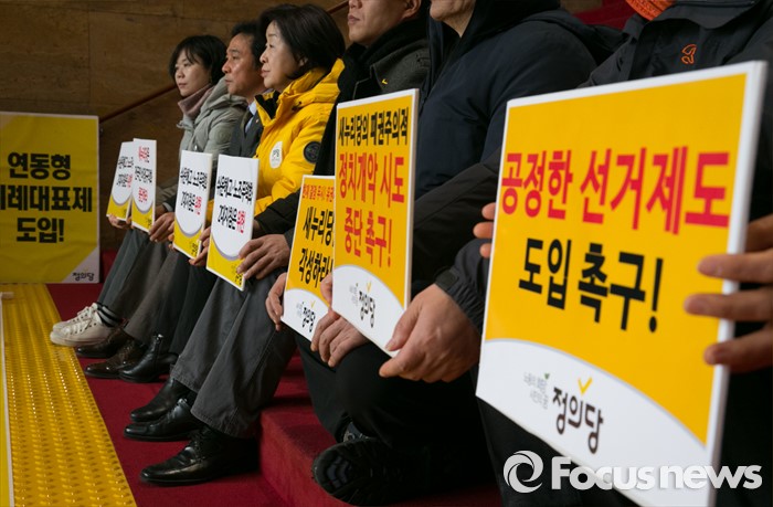 (서울=포커스뉴스) 26일 오전 서울 여의도 국회 본청 로텐더홀에서 심상정(왼쪽 세번째) 정의당 상임대표를 비롯한 의원 및 당직자들이 노동법 및 선거법 개악시도 중단 결의대회를 마친 뒤 농성을 이어가고 있다.