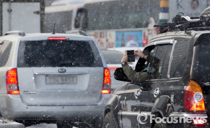 (서울=포커스뉴스) 서울을 비롯한 중부지역 곳곳에 눈이 내린 26일 오전 서울 광화문광장에서 한 운전자가 신호대기 중 휴대폰으로 눈을 촬영하고 있다.